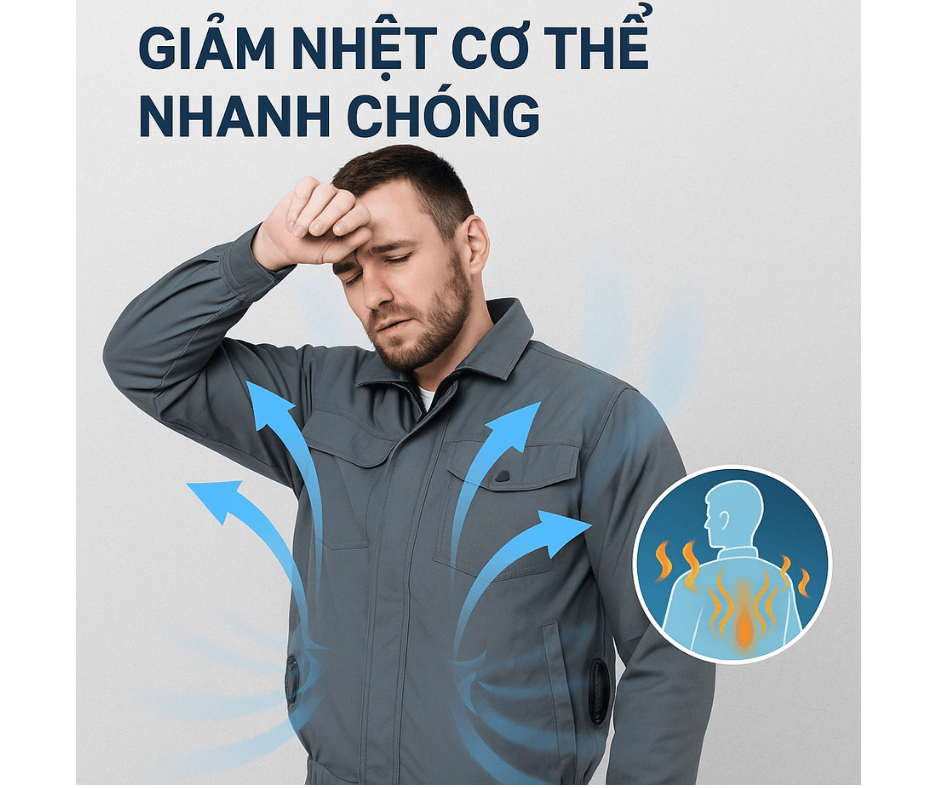 Điểm mạnh lớn nhất của áo điều hòa là khả năng làm mát tức thì. Với hệ thống quạt gió mini tích hợp, áo giúp lưu thông không khí liên tục, đẩy hơi nóng ra ngoài và giữ cơ thể ở mức nhiệt dễ chịu. Điều này cực kỳ hữu ích trong môi trường nắng nóng, đặc biệt khi làm việc ngoài trời hoặc trong nhà xưởng.