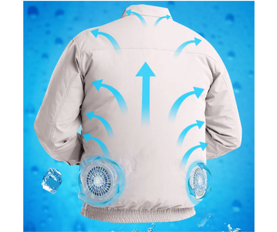 Nhờ 2 chiếc quạt gắn hai bên hông, áo hút khí mát từ ngoài vào, thổi đều quanh cơ thể, đẩy hơi nóng và mồ hôi ra ngoài. Mặc áo mà như có gió thổi theo suốt cả ngày.