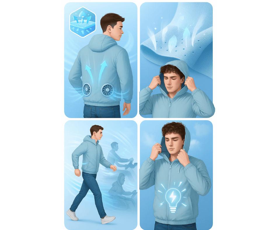 Công nghệ làm mát tiên tiến: Áo sử dụng các quạt gió siêu nhỏ hoặc công nghệ bay hơi/gel làm mát để tạo ra luồng khí mát lưu thông khắp cơ thể. Điều này giúp giảm nhiệt độ cơ thể một cách hiệu quả, mang lại cảm giác dễ chịu.