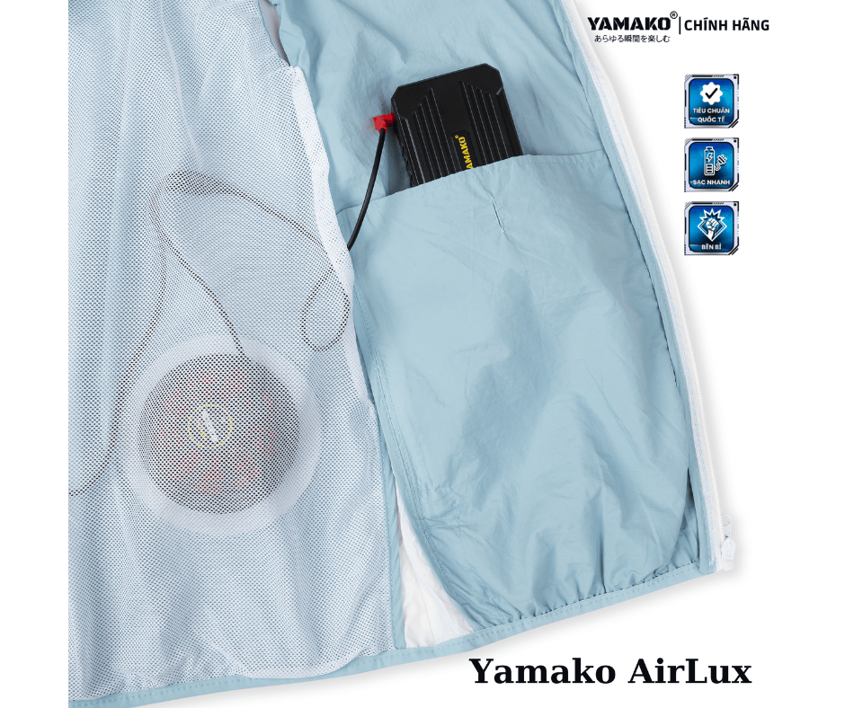 Pin sạc di động: Mỗi bộ áo điều hòa đều đi kèm với một viên pin lithium-polymer dung lượng cao. Pin này có thể sạc đầy và sử dụng liên tục trong nhiều giờ, từ 8 đến 16 tiếng tùy thuộc vào chế độ quạt. ( Đối với áo điều hòa Yamako )