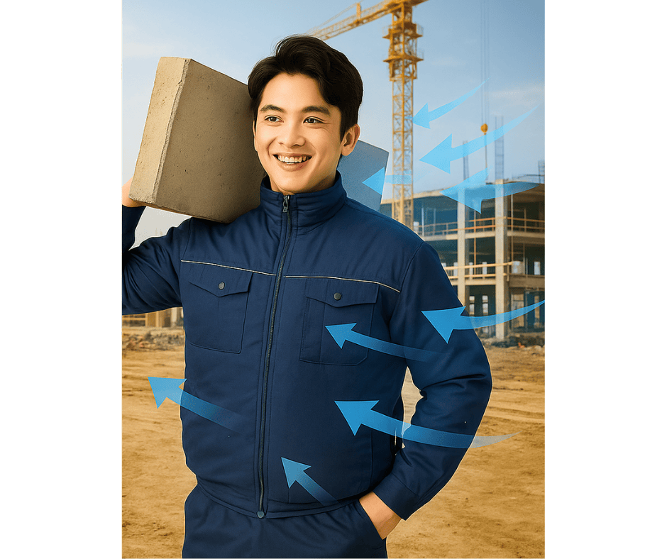 Hệ thống quạt độc lập: Hai quạt gió được gắn ở hai bên hông áo hoạt động hoàn toàn độc lập với nguồn điện bên ngoài. Chỉ cần pin còn năng lượng, quạt sẽ tiếp tục quay, tạo ra luồng gió làm mát liên tục.