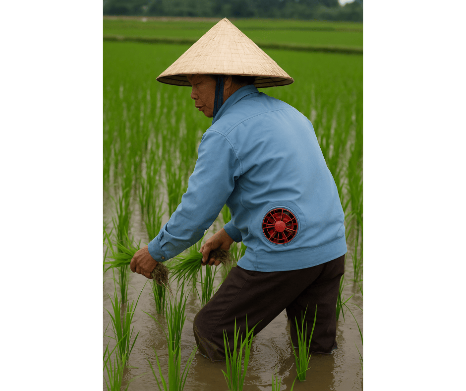 Đồng ruộng bát ngát: Những cánh đồng đầu hè còn sót nắng, bà con nông dân vẫn khoác áo điều hòa để hái trái, chăm cây. “Mồ hôi không còn nhỏ giọt, tôi làm việc nhẹ nhàng và an toàn hơn hẳn,” chị Loan ở Nam Định nói.