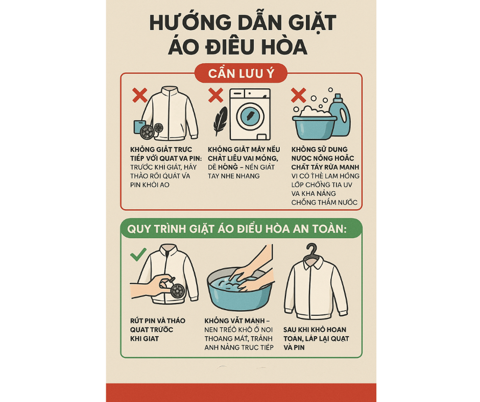 Không giặt trực tiếp với quạt và pin: Trước khi giặt, hãy tháo rời quạt và pin khỏi áo.