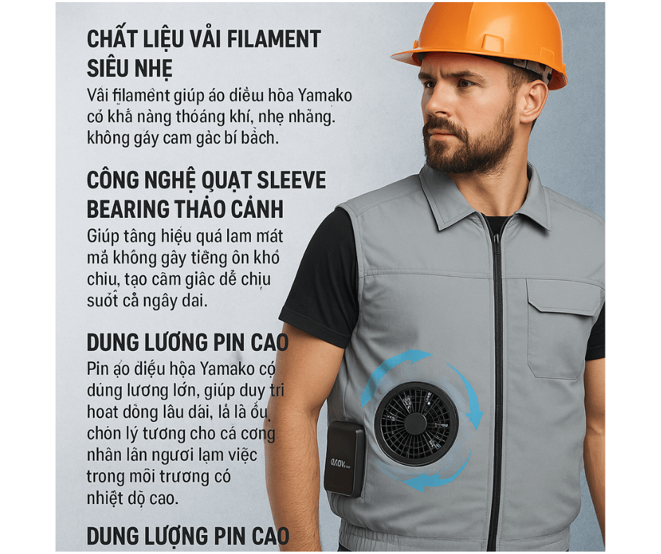Một trong những mẫu áo điều hòa ngắn tay đáng chú ý hiện nay chính là dòng áo điều hòa Yamako. Với công nghệ làm mát tiên tiến, khả năng hoạt động liên tục trong nhiều giờ và thiết kế siêu nhẹ, Yamako mang đến sự thoải mái cho người dùng, kể cả trong những ngày hè nóng nực.