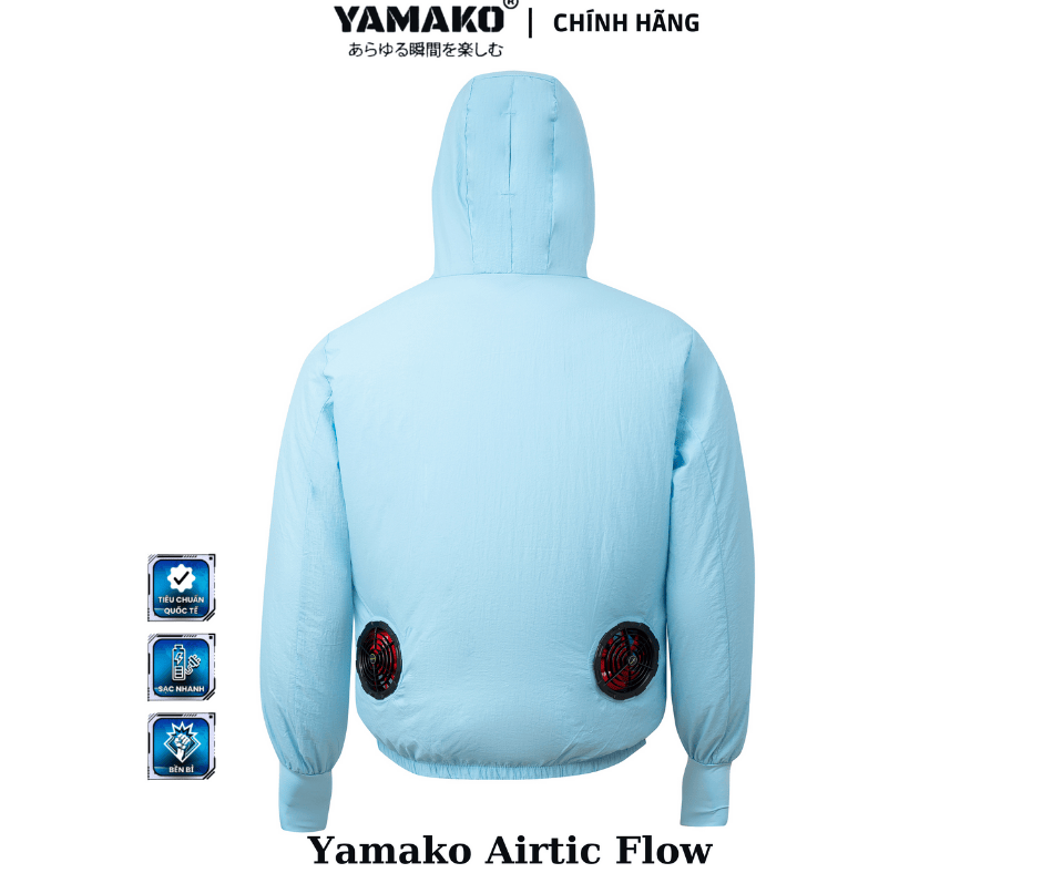 Với các dòng cao cấp như Yamako Hero Light, áo chỉ nặng 300–400g, nhẹ hơn cả một chiếc áo gió. Phần quạt làm bằng công nghệ sleeve bearing, không cánh vướng víu, tháo rời nhanh chóng khi giặt.