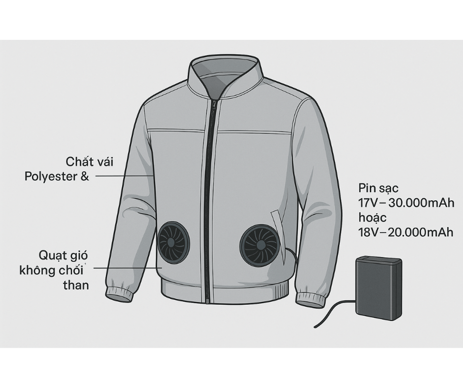 Áo khoác chuyên dụng: Được làm từ các chất liệu vải thoáng khí nhưng vẫn đủ kín để giữ luồng gió bên trong (thường là polyester, kaki hoặc các loại vải pha cotton chống UV). Áo được thiết kế với các lỗ để gắn quạt.