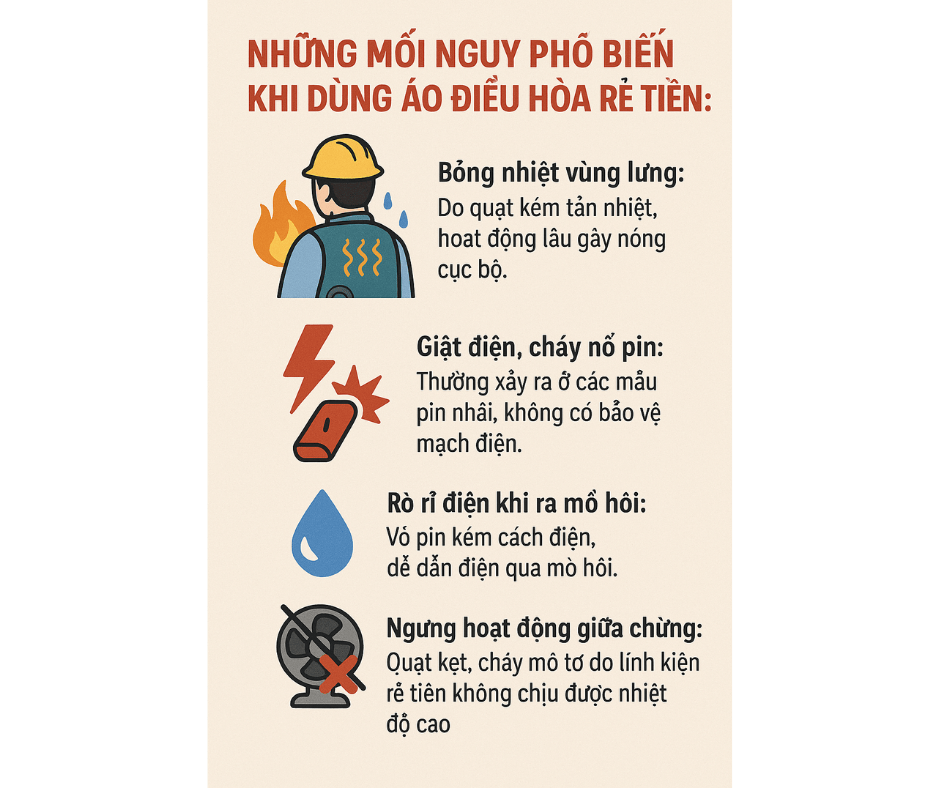 Trong những ngày hè nắng như thiêu, áo điều hòa đã trở thành "cứu tinh" cho người lao động ngoài trời. Tuy nhiên, bên cạnh lợi ích làm mát, đã có nhiều cảnh báo về rủi ro nghiêm trọng từ việc sử dụng áo điều hòa rẻ tiền, kém chất lượng: bỏng nhiệt, chập cháy, thậm chí giật điện. Bài viết này sẽ giúp bạn hiểu rõ hơn về các mối nguy và cách chọn áo điều hòa an toàn, hiệu quả.