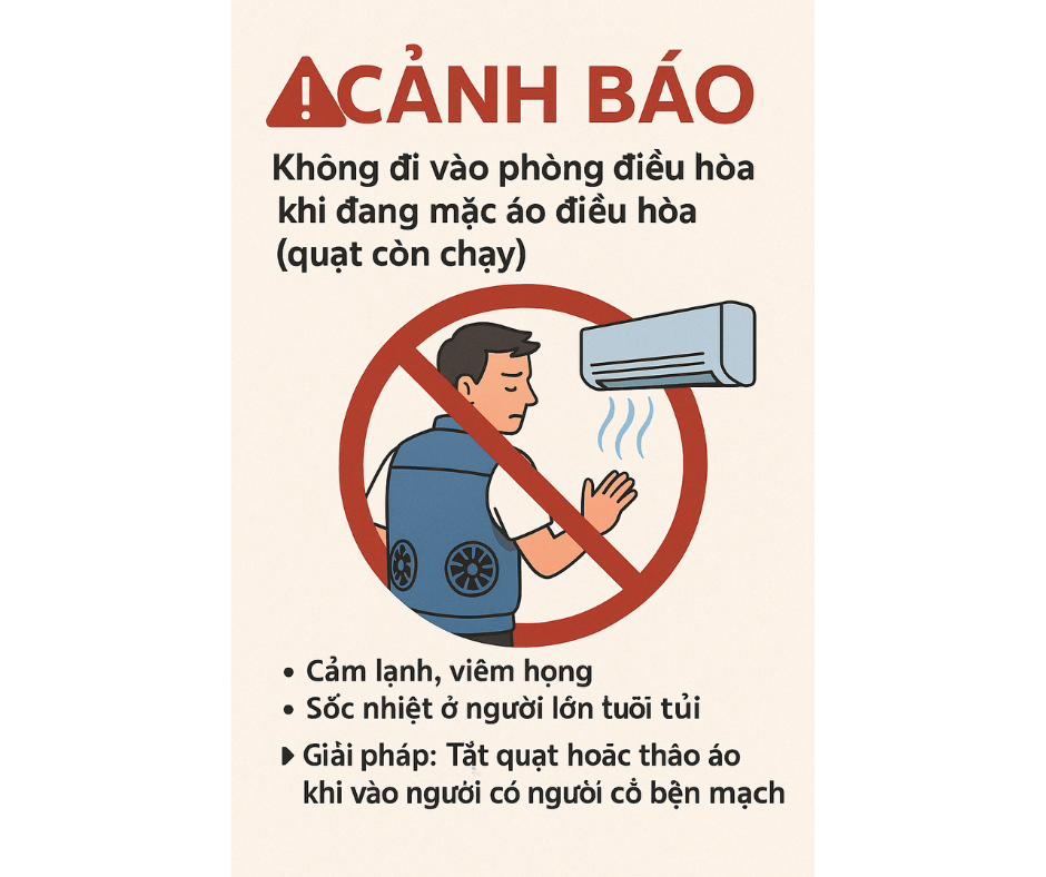 👉 Giải pháp: Tắt quạt hoặc tháo áo khi vào phòng điều hòa, thay bằng áo mỏng nhẹ, khô ráo.