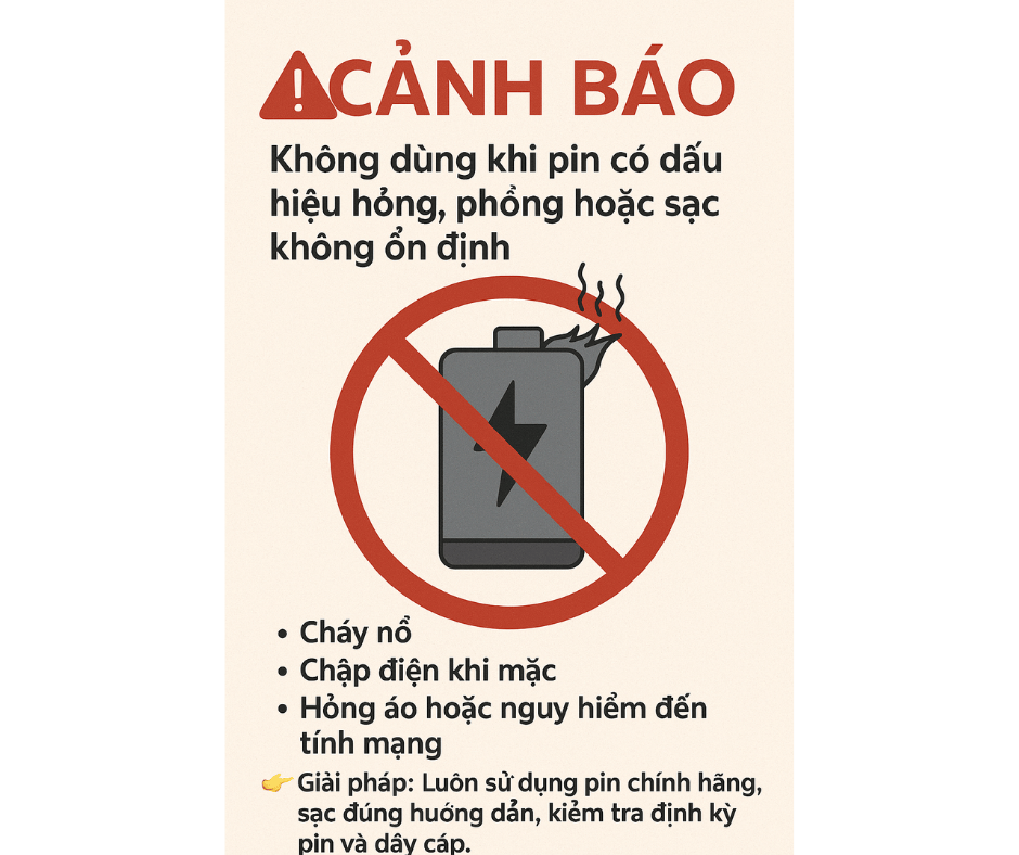 👉 Giải pháp: Luôn sử dụng pin chính hãng, sạc đúng hướng dẫn, kiểm tra định kỳ pin và dây cáp.