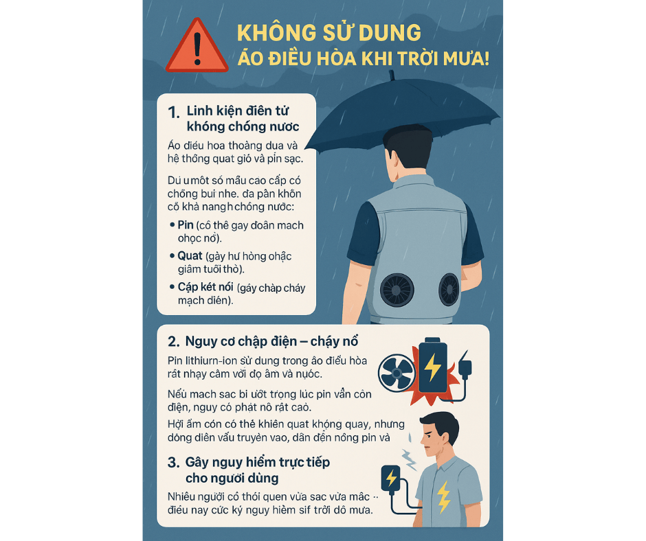 Đừng vì một chút tiện lợi mà đánh đổi bằng sức khỏe và sự an toàn của bạn. Áo điều hòa là công cụ hữu ích, nhưng chỉ khi được sử dụng đúng cách. Khi trời mưa, tốt nhất hãy tháo pin – cất áo – đợi khô ráo rồi mới dùng lại.