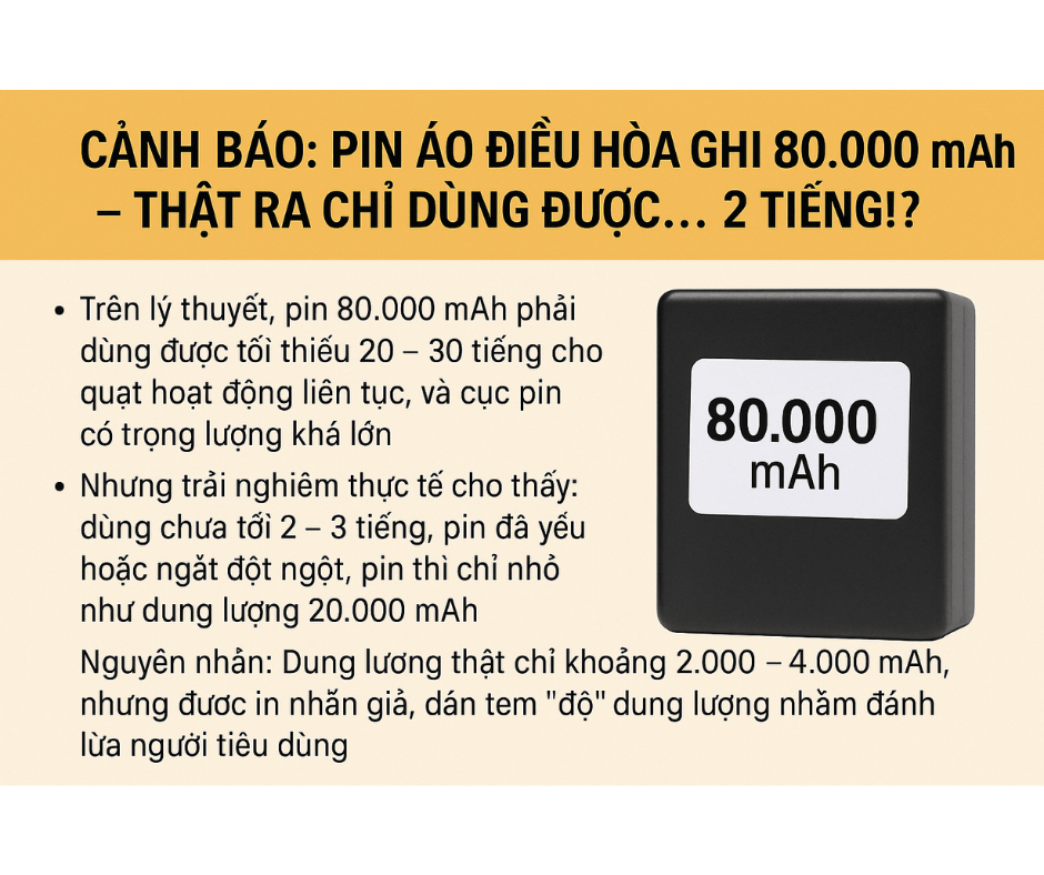 Hiện nay trên thị trường, nhiều mẫu pin quạt áo điều hòa giá rẻ được rao bán với thông số “khủng” như 80.000 mAh, 90.000 mAh với giá chỉ từ 300.000–400.000đ. Nghe qua tưởng là “món hời”, nhưng thực tế lại ẩn chứa nguy cơ rất lớn cho người sử dụng.