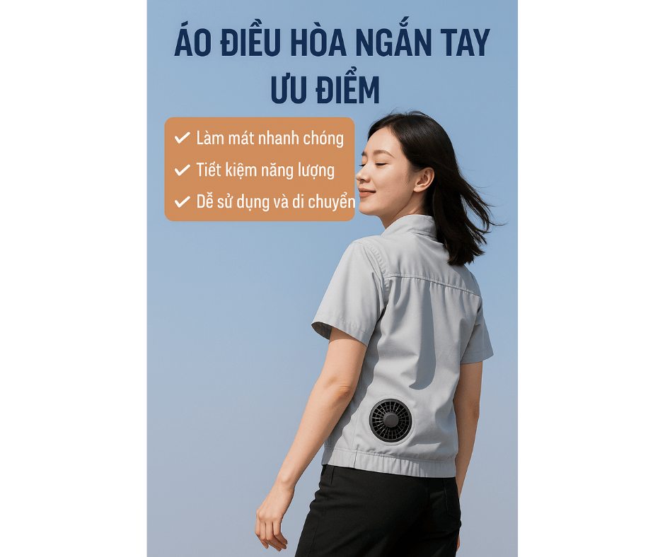 Áo điều hòa ngắn tay là loại áo được thiết kế đặc biệt với quạt gió mini tích hợp hai bên hông hoặc lưng, giúp tạo luồng không khí lưu thông bên trong áo. Nhờ đó, người mặc cảm thấy mát mẻ, dễ chịu, nhất là trong thời tiết nắng nóng gay gắt.
