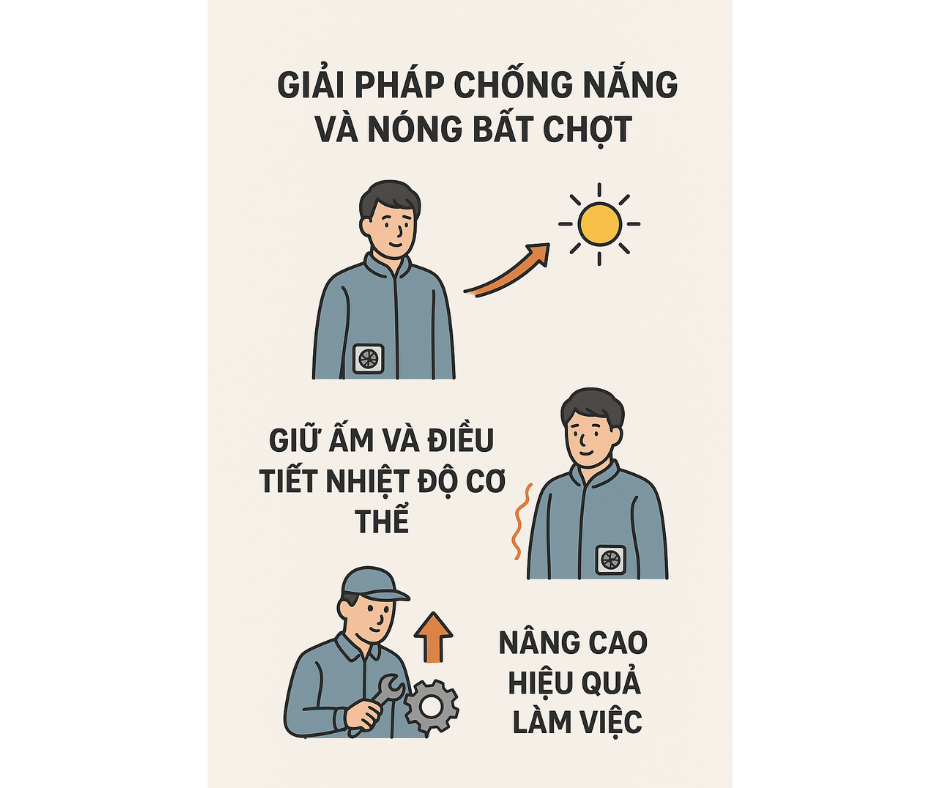 Mùa thu ở Việt Nam không phải lúc nào cũng mát mẻ. Nhiều ngày vẫn có nắng gắt, đặc biệt là vào buổi trưa. Hơn nữa, những người lao động ngoài trời hoặc trong môi trường nhà xưởng nóng bức vẫn cần một giải pháp hiệu quả để duy trì sự thoải mái. Đây là lúc áo điều hòa phát huy tối đa công dụng.