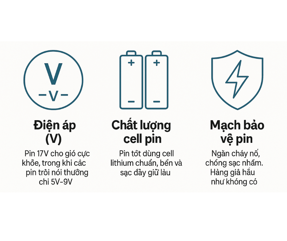 Điện áp (V) – Pin 17V cho gió cực khỏe, trong khi các pin trôi nổi thường chỉ 5V–9V.