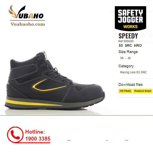 - Giày bảo hộ chịu nhiệt Safety Jogger Speedy S3 SRC HRO (ENISO20345:2011) là mẫu giày bảo hộ chịu nhiệt Jogger lên tới 300 độ C với độ an toàn cao S3.