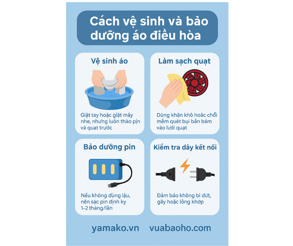 Vệ sinh áo: Giặt tay hoặc giặt máy nhẹ, nhưng luôn tháo pin và quạt trước.