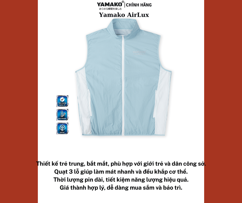 Áo điều hòa Ba Lỗ Yamako Hero Light 2025 không chỉ là giải pháp làm mát thông minh mà còn là món đồ thời trang giúp bạn tự tin thể hiện phong cách. Hãy áp dụng ngay những hướng dẫn sử dụng và mẹo tiết kiệm pin trên để trải nghiệm sự mát mẻ tối ưu, đồng thời giữ cho áo luôn bền đẹp theo thời gian.