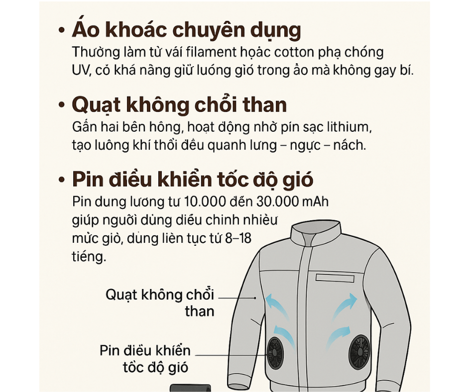 Quạt không chổi than: Gắn hai bên hông, hoạt động nhờ pin sạc lithium, tạo luồng khí thổi đều quanh lưng – ngực – nách.