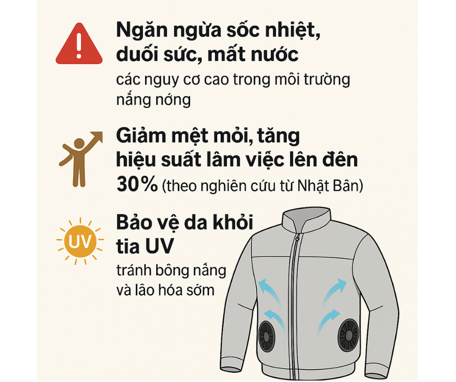 Sở hữu áo điều hòa không chỉ giúp bạn vượt qua mùa hè khắc nghiệt, mà còn bảo vệ sức khỏe và nâng cao hiệu suất lao động – xứng đáng là người bạn đồng hành không thể thiếu trong thời đại biến đổi khí hậu.