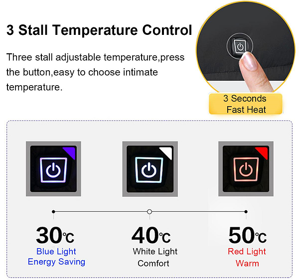 Áo khoác có sưởi ấm chống lạnh cực tốt với 3 chế độ nhiệt độ điều chỉnh được: 60 độ, 50 độ, 40 độ