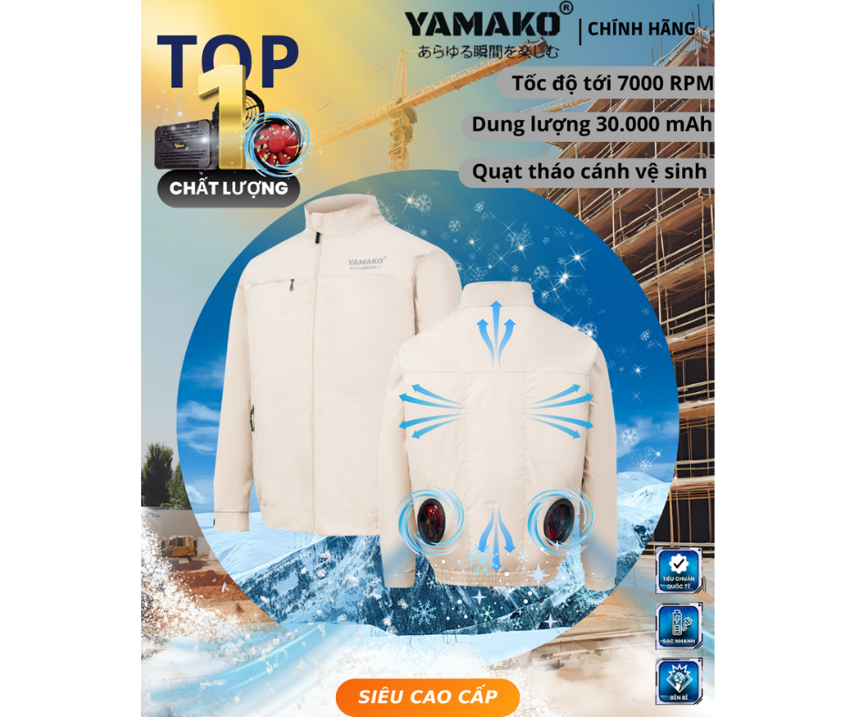 Pin Yamako 30.000 mAh tuy thông số “khiêm tốn” hơn hàng quảng cáo 60.000 mAh, nhưng thực tế chạy được 8–18 tiếng tùy cấp độ, giữ gió mạnh ổn định suốt cả ngày. Pin áo điều hòa Yamako của đang là loại cao nhất thị trường hiện nay
