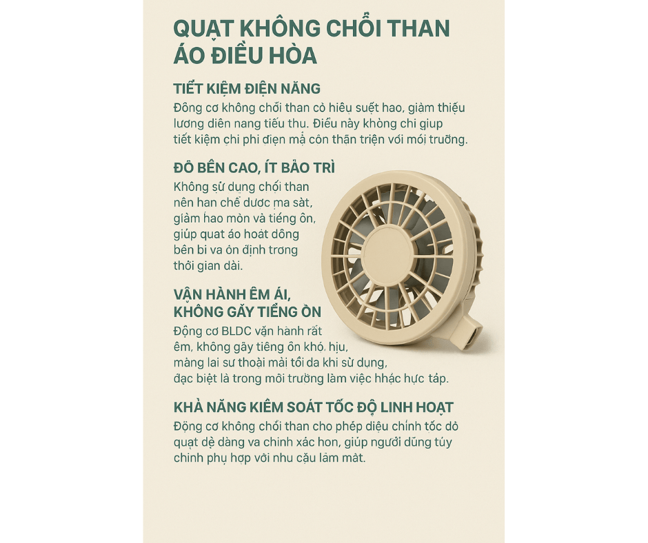 Nếu bạn đang cân nhắc đầu tư một chiếc quạt áo điều hòa mới hoặc muốn nâng cấp chiếc quạt hiện tại, đừng bỏ qua động cơ không chổi than – công nghệ làm mát tiên tiến, khác biệt và bền bỉ!