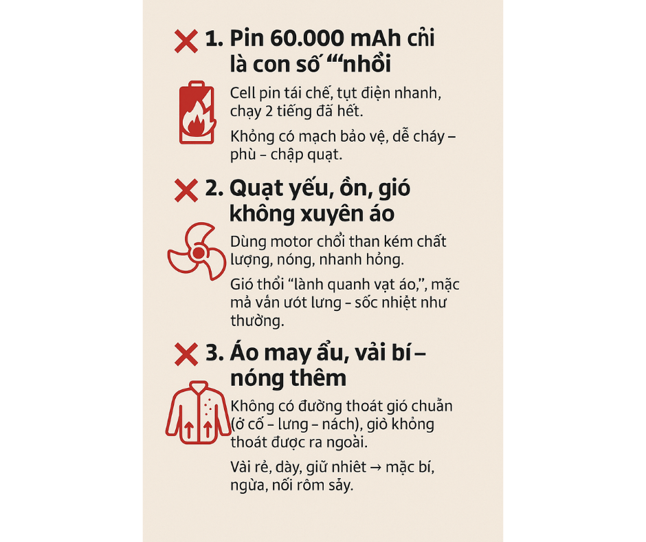 Mua áo điều hòa giá rẻ để tiết kiệm? Nhưng rồi bạn phải mua thêm pin khác, quạt khác, thậm chí áo khác chỉ sau vài tuần. Mất thời gian, mất tiền, mất niềm tin.