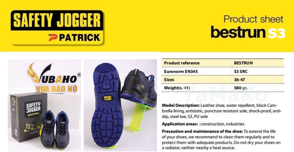 BESTRUN là model giày Safety Jogger bán chạy nhất của hãng. Đạt tiêu chuẩn Châu Âu EN 20345, giày Jogger Bestrun là đôi giày bảo hộ giá rẻ, nồi đồng cối đá và đáng đồng tiền bát gạo nhất. Nó được sử dụng rộng rãi tại các công trình xây dựng nhờ mang đầy đủ các tính năng bảo vệ không thua kém các đôi giày bảo hộ cao cấp khác: chống đinh, chống dập ngón, chống tĩnh điện, chống trượt, chống nước, chống dầu…