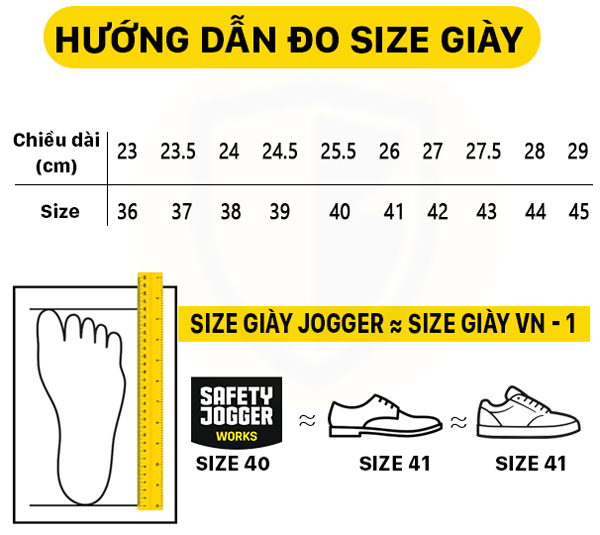 Nếu bạn chưa đi giày của hãng Safety Jogger bao giờ thì nên đo lại chân cho chắc. Vì giày này size Châu Âu, đã rộng hơn size VN từ 1-2 số rồi. Nếu lấy bằng size giày VN có thể bị rộng đấy.