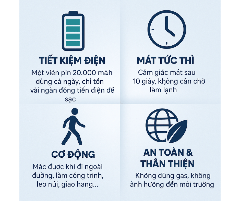 👉 Kết luận: Áo điều hòa là lựa chọn thông minh cho người lao động, shipper, tài xế, kỹ sư, hay người cao tuổi muốn mát mẻ mà không tốn tiền triệu.
